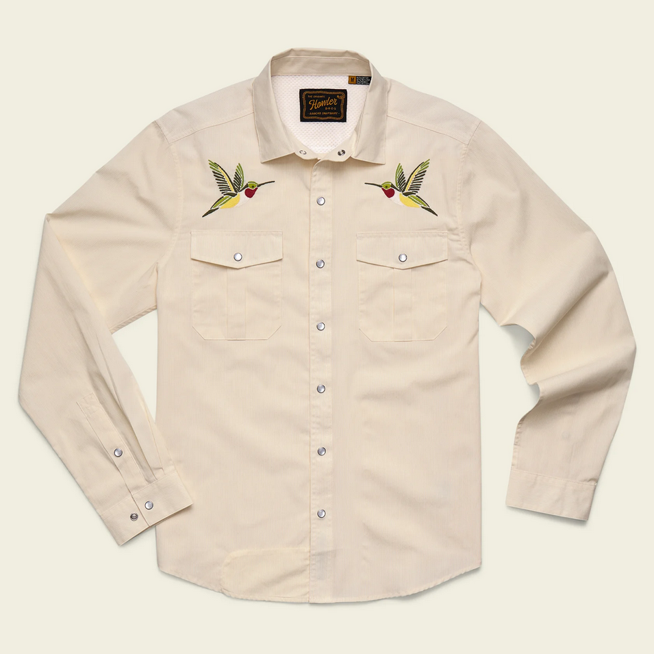 Our desire to make the Gaucho Snapshirt is one of the reasons we started Howler Brothers in the first place. We wanted to transform the vintage western shirts of the past into something technical and wearable in everyday life while maintaining a little of their quirky nature and penchant for unique, embroidered artwork. We succeeded in a big way by making ours out of lightweight, quick drying blended fabric and adding a cooling mesh-lined vented back yoke to keep it cool when the temperatures are cooking. We threw in pleated chest pockets, pearl snaps, and an ever-evolving slate of custom embroidery.