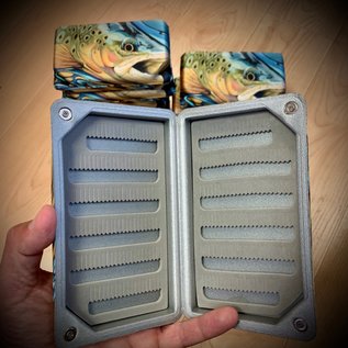 Lightweight floating fly box made from EVA foam covered with Trout pattern lycra. Features teardrop foam and magnetic closure